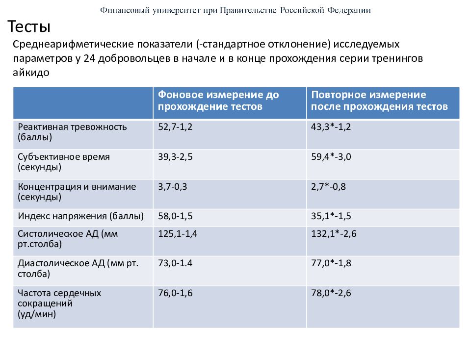 Среднеарифметические показатели (-стандартное отклонение) исследуемых параметров у 24 добровольцев в начале и в конце прохождения серии тренингов айкидо Фоновое измерение до прохождение тестов Повторное измерение после прохождения тестов Реактивная тревожность (баллы) 52,7-1,2 43,3*-1,2 Субъективное время (секунды) 39,3-2,5 59,4*-3,0 Концентрация и внимание (секунды) 3,7-0,3 2,7*-0,8 Индекс напряжения (баллы) 58,0-1,5 35,1*-1,5 Систолическое АД (мм рт.столба ) 125,1-1,4 132,1*-2,6 Диастолическое АД (мм рт. столба) 73,0-1.4 77,0*-1,8 Частота сердечных сокращений (уд/мин) 76,0-1,6 78,0*-2,6