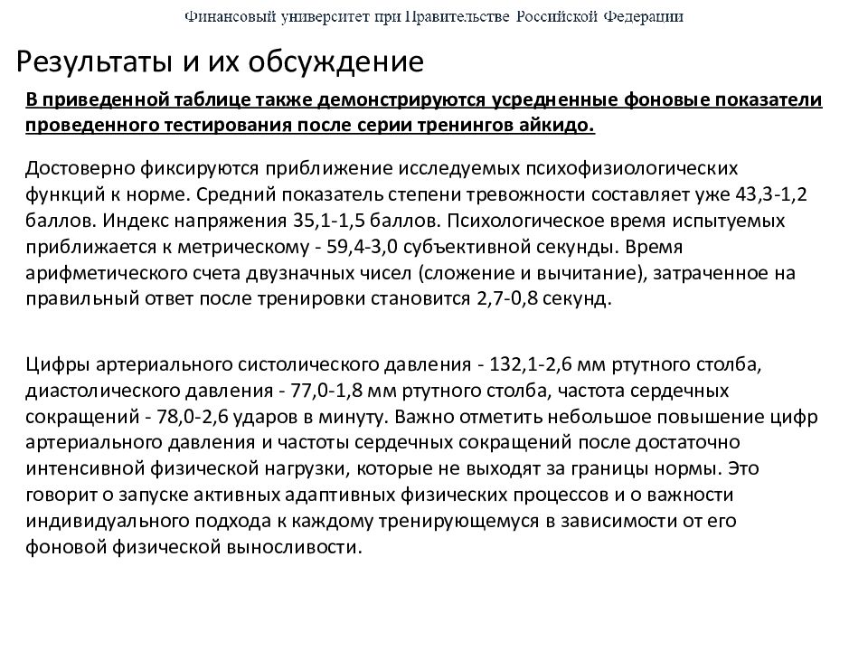 В приведенной таблице также демонстрируются усредненные фоновые показатели проведенного тестирования после серии тренингов айкидо. Достоверно фиксируются приближение исследуемых психофизиологических функций к норме. Средний показатель степени тревожности составляет уже 43,3-1,2 баллов. Индекс напряжения 35,1-1,5 баллов. Психологическое время испытуемых приближается к метрическому - 59,4-3,0 субъективной секунды. Время арифметического счета двузначных чисел (сложение и вычитание), затраченное на правильный ответ после тренировки становится 2,7-0,8 секунд. Цифры артериального систолического давления - 132,1-2,6 мм ртутного столба, диастолического давления - 77,0-1,8 мм ртутного столба, частота сердечных сокращений - 78,0-2,6 ударов в минуту. Важно отметить небольшое повышение цифр артериального давления и частоты сердечных сокращений после достаточно интенсивной физической нагрузки, которые не выходят за границы нормы. Это говорит о запуске активных адаптивных физических процессов и о важности индивидуального подхода к каждому тренирующемуся в зависимости от его фоновой физической выносливости.