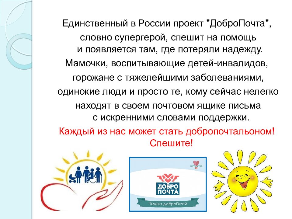 Единственный в России проект " ДоброПочта ", словно супергерой, спешит на помощь и появляется там, где потеряли надежду. Мамочки, воспитывающие детей-инвалидов, горожане с тяжелейшими заболеваниями, одинокие люди и просто те, кому сейчас нелегко находят в своем почтовом ящике письма с искренними словами поддержки. Каждый из нас может стать добропочтальоном ! Спешите!