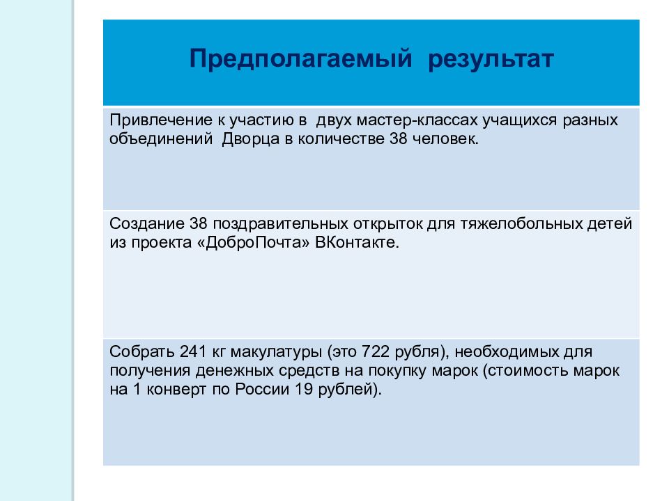 Предполагаемый результат Привлечение к участию в двух мастер-классах учащихся разных объединений Дворца в количестве 38 человек. Создание 38 поздравительных открыток для тяжелобольных детей из проекта « ДоброПочта » ВКонтакте. Собрать 241 кг макулатуры (это 722 рубля), необходимых для получения денежных средств на покупку марок (стоимость марок на 1 конверт по России 19 рублей).