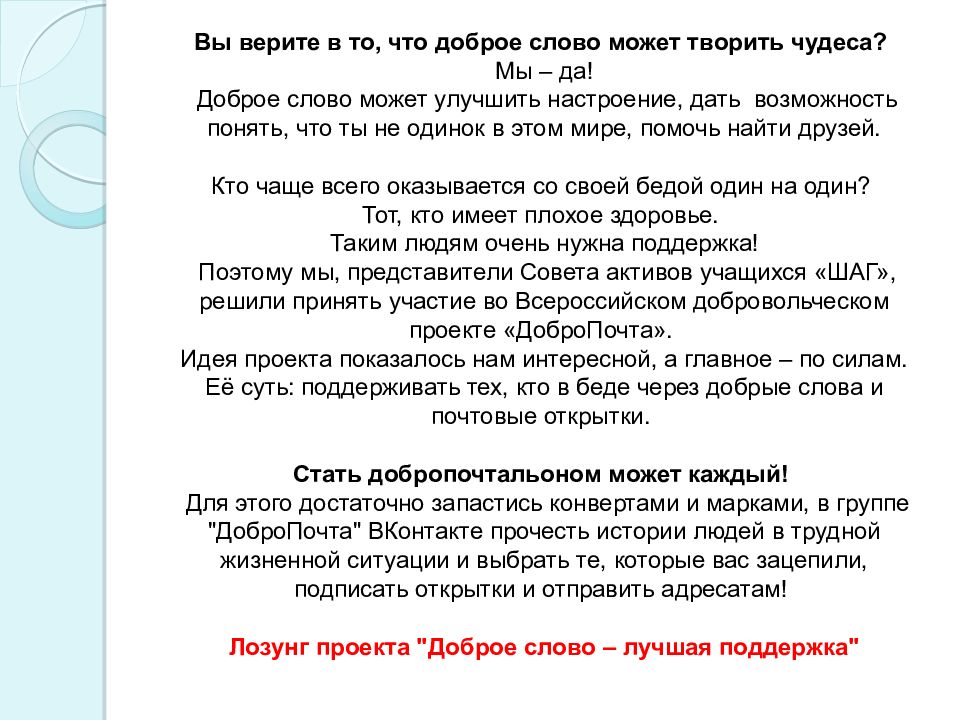 Слайд 2: Вы верите в то, что доброе слово может творить чудеса? Мы – да! Доброе слово может улучшить настроение, дать возможность понять, что ты не одинок в этом мире, помочь найти друзей. Кто чаще всего оказывается со своей бедой один на один? Тот, кто имеет плохое здоровье. Таким людям очень нужна поддержка! Поэтому мы, представители Совета активов учащихся «ШАГ», решили принять участие во Всероссийском добровольческом проекте « ДоброПочта ». Идея проекта показалось нам интересной, а главное – по силам. Её суть: поддерживать тех, кто в беде через добрые слова и почтовые открытки. Стать добропочтальоном может каждый! Для этого достаточно запастись конвертами и марками, в группе " ДоброПочта " ВКонтакте прочесть истории людей в трудной жизненной ситуации и выбрать те, которые вас зацепили, подписать открытки и отправить адресатам! Лозунг проекта "Доброе слово – лучшая поддержка"