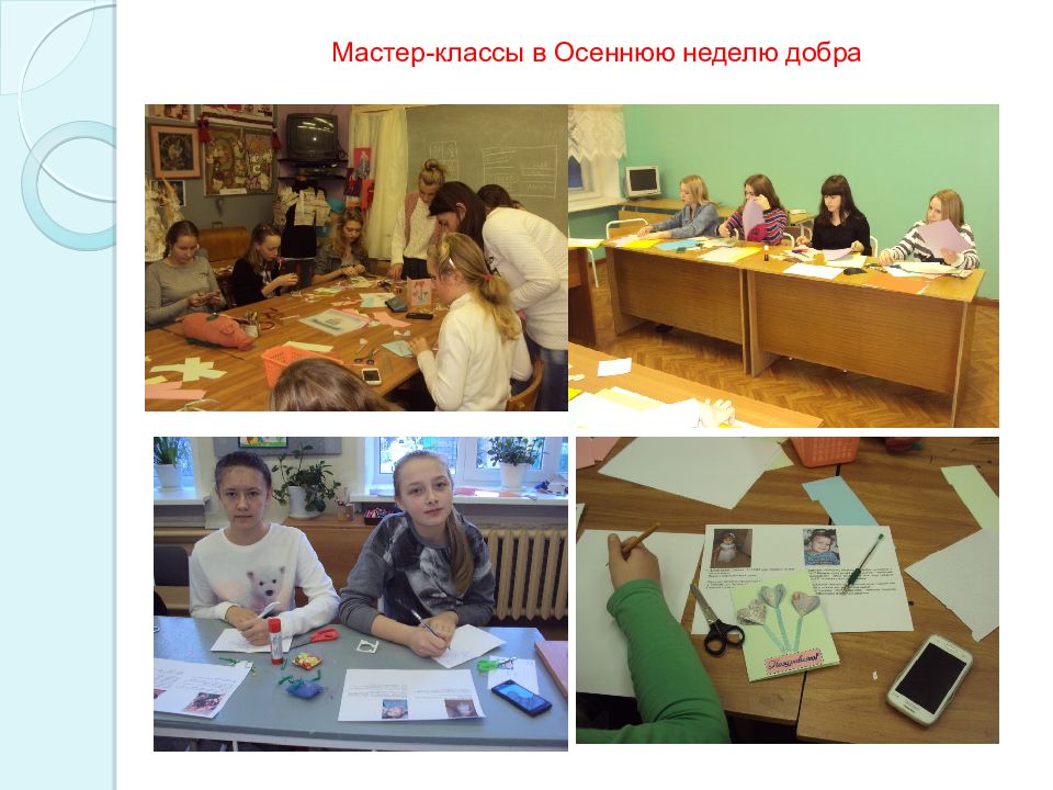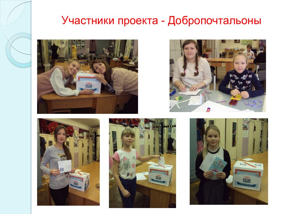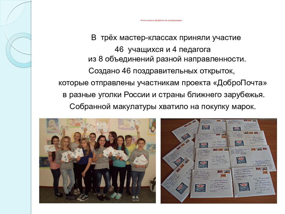 В трёх мастер-классах приняли участие 46 учащихся и 4 педагога из 8 объединений разной направленности. Создано 46 поздравительных открыток, которые отправлены участникам проекта « ДоброПочта » в разные уголки России и страны ближнего зарубежья. Собранной макулатуры хватило на покупку марок.