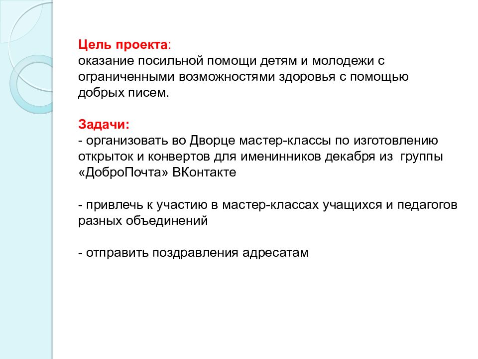 Слайд 3: Цель проекта : оказание посильной помощи детям и молодежи с ограниченными возможностями здоровья с помощью добрых писем. Задачи: - организовать во Дворце мастер-классы по изготовлению открыток и конвертов для именинников декабря из группы « ДоброПочта » ВКонтакте - привлечь к участию в мастер-классах учащихся и педагогов разных объединений - отправить поздравления адресатам