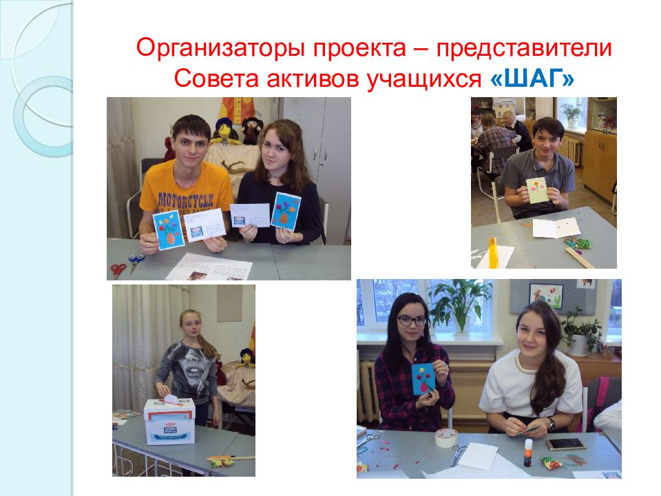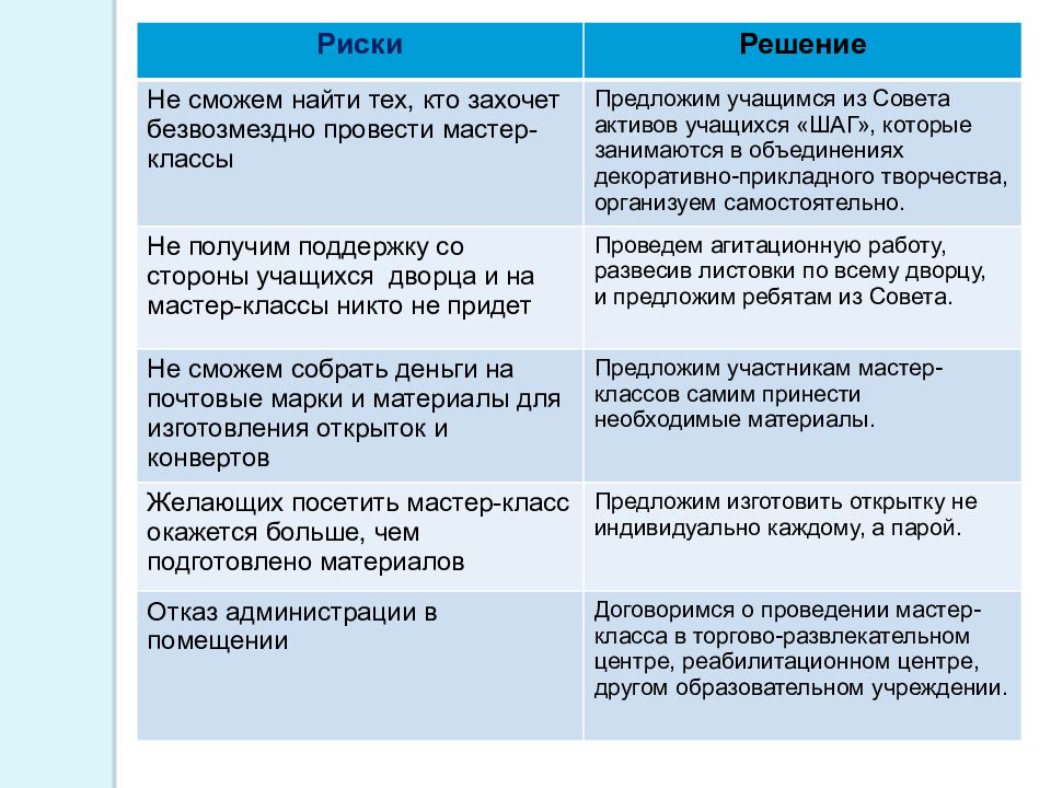 Риски Решение Не сможем найти тех, кто захочет безвозмездно провести мастер-классы Предложим учащимся из Совета активов учащихся «ШАГ», которые занимаются в объединениях декоративно-прикладного творчества, организуем самостоятельно. Не получим поддержку со стороны учащихся дворца и на мастер-классы никто не придет Проведем агитационную работу, развесив листовки по всему дворцу, и предложим ребятам из Совета. Не сможем собрать деньги на почтовые марки и материалы для изготовления открыток и конвертов Предложим участникам мастер-классов самим принести необходимые материалы. Желающих посетить мастер-класс окажется больше, чем подготовлено материалов Предложим изготовить открытку не индивидуально каждому, а парой. Отказ администрации в помещении Договоримся о проведении мастер-класса в торгово-развлекательном центре, реабилитационном центре, другом образовательном учреждении.