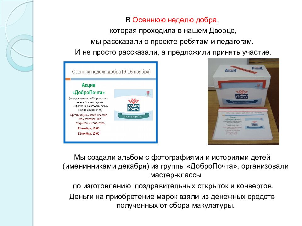 В Осеннюю неделю добра, которая проходила в нашем Дворце, мы рассказали о проекте ребятам и педагогам. И не просто рассказали, а предложили принять участие. Мы создали альбом с фотографиями и историями детей (именинниками декабря) из группы « ДоброПочта », организовали мастер-классы по изготовлению поздравительных открыток и конвертов. Деньги на приобретение марок взяли из денежных средств полученных от сбора макулатуры.