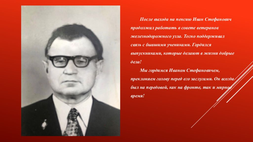 После выхода на пенсию Иван Стефанович продолжал работать в совете ветеранов железнодорожного узла. Тесно поддерживал связь с бывшими учениками. Гордился выпускниками, которые делают в жизни добрые дела! Мы гордимся Иваном Стефановичем, преклоняем голову перед его заслугами. Он всегда был на передовой, как на фронте, так и мирное время!