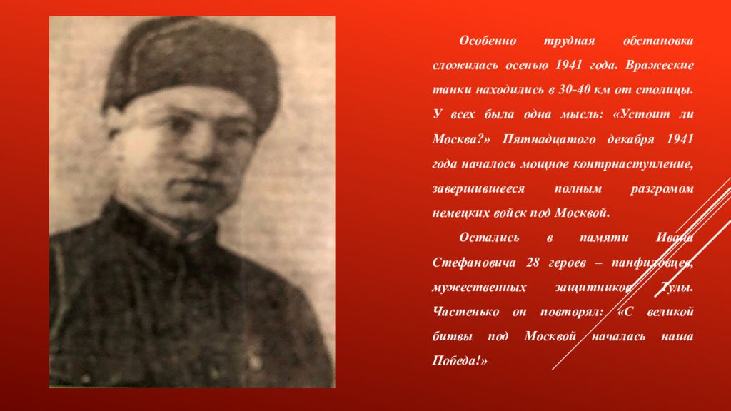 Особенно трудная обстановка сложилась осенью 1941 года. Вражеские танки находились в 30-40 км от столицы. У всех была одна мысль: «Устоит ли Москва?» Пятнадцатого декабря 1941 года началось мощное контрнаступление, завершившееся полным разгромом немецких войск под Москвой. Остались в памяти Ивана Стефановича 28 героев – панфиловцев, мужественных защитников Тулы. Частенько он повторял: «С великой битвы под Москвой началась наша Победа!»