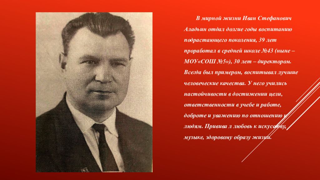 В мирной жизни Иван Стефанович Аладьин отдал долгие годы воспитанию подрастающего поколения, 39 лет проработал в средней школе №43 (ныне – МОУ«СОШ №5»), 30 лет – директором. Всегда был примером, воспитывал лучшие человеческие качества. У него учились настойчивости в достижении цели, ответственности в учебе и работе, доброте и уважению по отношению к людям. Привива л любовь к искусству, музыке, здоровому образу жизни.