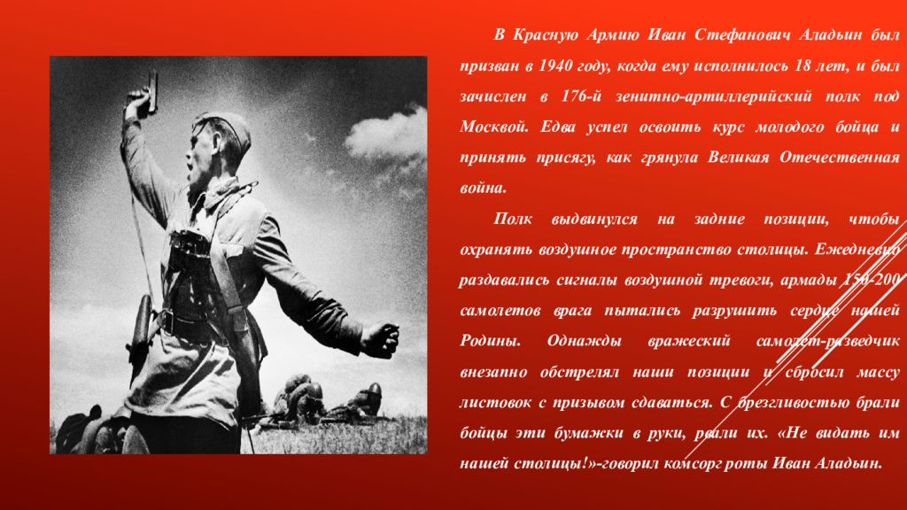 В Красную Армию Иван Стефанович Аладьин был призва н в 1940 году, когда ему исполнилось 18 лет, и был зачислен в 176-й зенитно-артиллерийский полк под Москвой. Едва успел освоить курс молодого бойца и принять присягу, как грянула Великая Отечественная война. Полк выдвинулся на задние позиции, чтобы охранять воздушное пространство столицы. Ежедневно раздавались сигналы воздушной тревоги, армады 150-200 самолетов врага пытались разрушить сердце нашей Родины. Однажды вражеский самолет-разведчик внезапно обстрелял наши позиции и сбросил массу листовок с призывом сдаваться. С брезгливостью брали бойцы эти бумажки в руки, рвали их. «Не видать им нашей столицы!»-говорил комсорг роты И ван Аладьин.