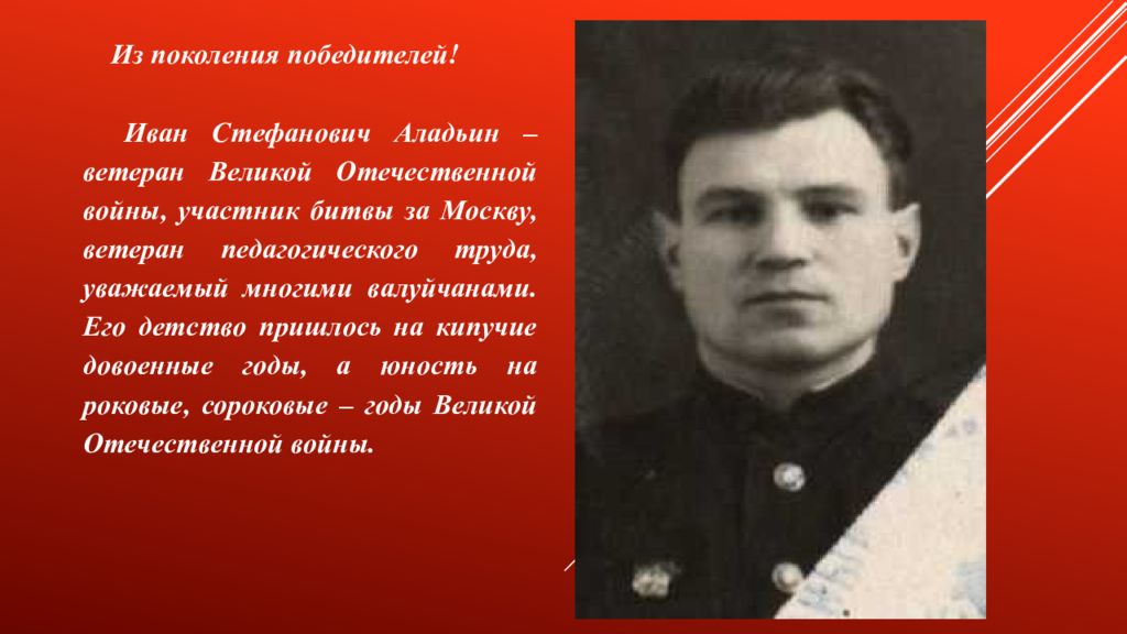 Из поколения победителей! Иван Стефанович Аладьин – ветеран Великой Отечественной войны, участник битвы за Москву, ветеран педагогического труда, уважаемый многими валуйчанами. Его детство пришлось на кипучие довоенные годы, а юность на роковые, сороковые – годы Великой Отечественной войны.