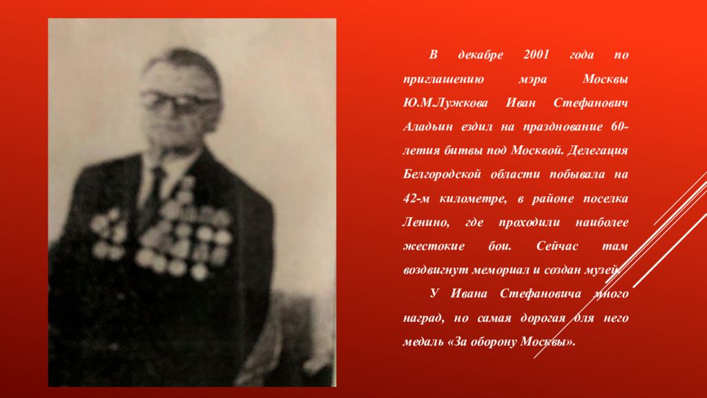 В декабре 2001 года по приглашению мэра Москвы Ю.М.Лужкова Иван Стефанович Аладьин ездил на празднование 60-летия битвы под Москвой. Делегация Белгородской области побывала на 42-м километре, в районе поселка Ленино, где проходили наиболее жестокие бои. Сейчас там воздвигнут мемориал и создан музей. У Ивана Стефановича много наград, но самая дорогая для него медаль «За оборону Москвы».