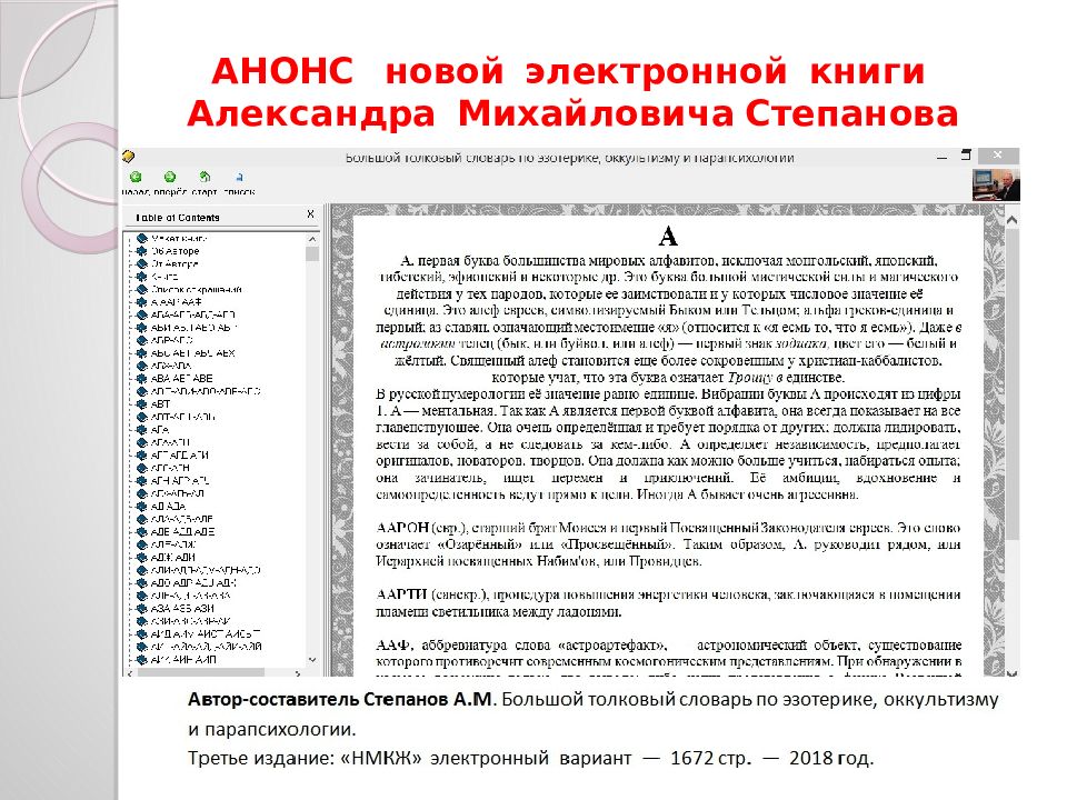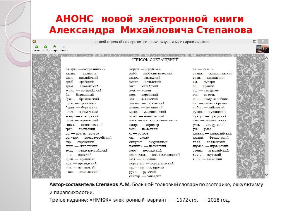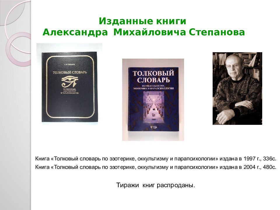 Книга «Толковый словарь по эзотерике, оккультизму и парапсихологии» издана в 1997 г., 336с. Книга «Толковый словарь по эзотерике, оккультизму и парапсихологии» издана в 2004 г., 480с. Тиражи книг распроданы.