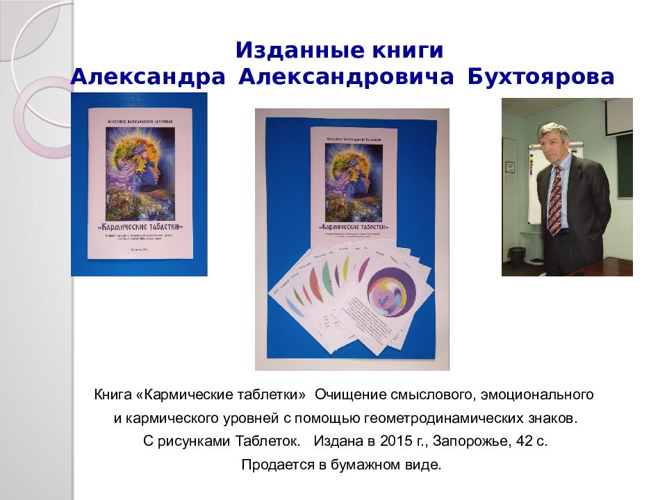 Книга « Кармические таблетки» Очищение смыслового, эмоционального и кармического уровней с помощью геометродинамических знаков. С рисунками Таблеток. Издана в 2015 г., Запорожье, 42 с. Продается в бумажном виде.