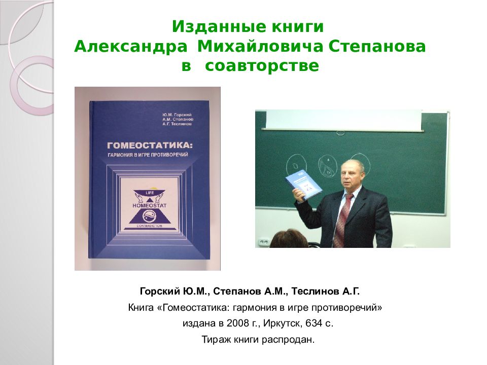 Горский Ю.М., Степанов А.М., Теслинов А.Г. Книга « Гомеостатика : гармония в игре противоречий» издана в 2008 г., Иркутск, 634 с. Тираж книги распродан.