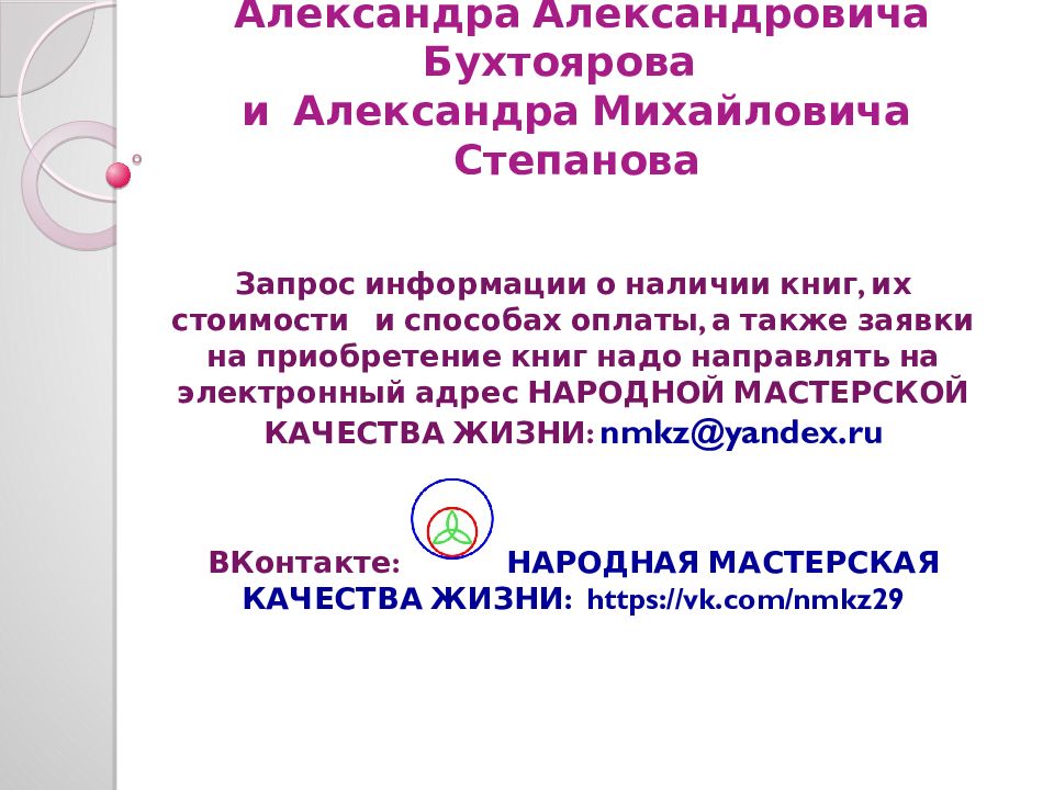 Запрос информации о наличии книг, их стоимости и способах оплаты, а также заявки на приобретение книг надо направлять на электронный адрес НАРОДНОЙ МАСТЕРСКОЙ КАЧЕСТВА ЖИЗНИ: nmkz@yandex.ru ВКонтакте : НАРОДНАЯ МАСТЕРСКАЯ КАЧЕСТВА ЖИЗНИ: https ://vk.com/nmkz29