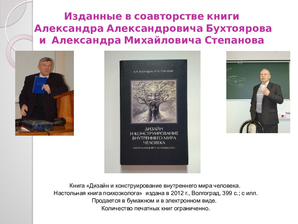 Книга «Дизайн и конструирование внутреннего мира человека. Настольная книга психоэколога » издана в 2012 г., Волгоград, 399 с.; с илл. Продается в бумажном и в электронном виде. Количество печатных книг ограниченно.
