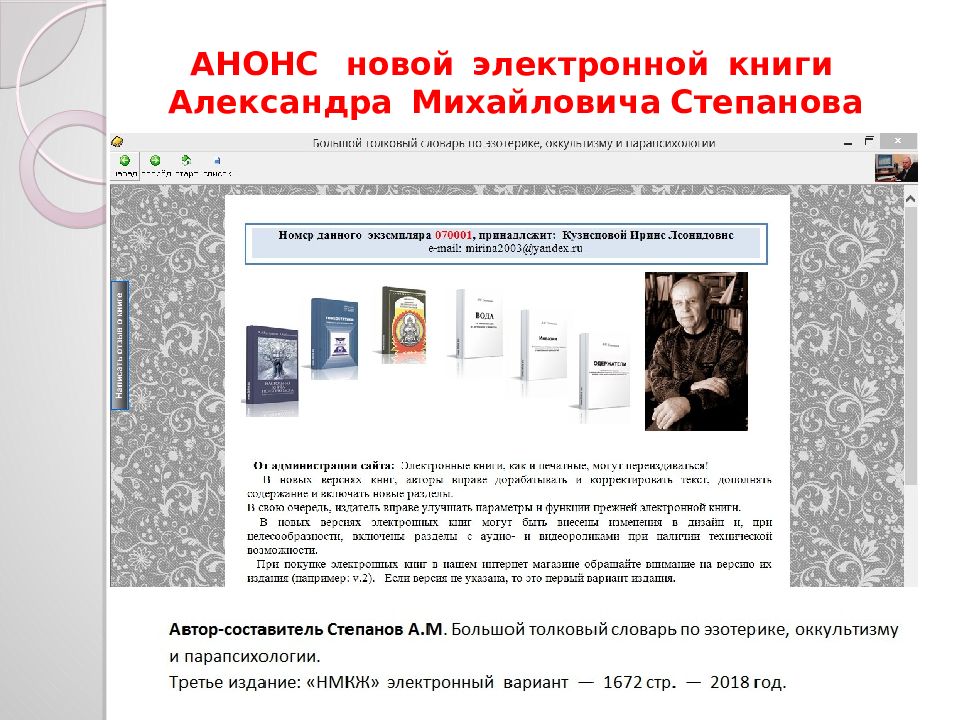 Книги А.А. Бухтоярова и А.М. Степанова в электронном виде изготавливаются в целях соблюдения их авторского права именными, с указанием ФИО приобретателя и направляются на электронную почту, указанную в заявке на книгу. Пример оформления именной книги: