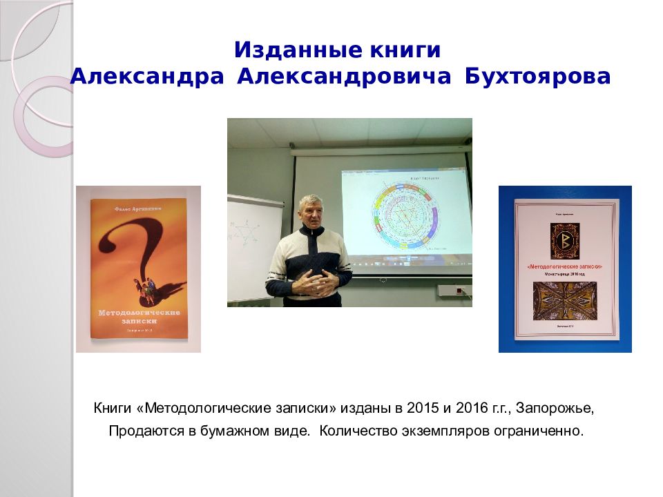 Книги «Методологические записки» изданы в 2015 и 2016 г.г., Запорожье, Продаются в бумажном виде. Количество экземпляров ограниченно.