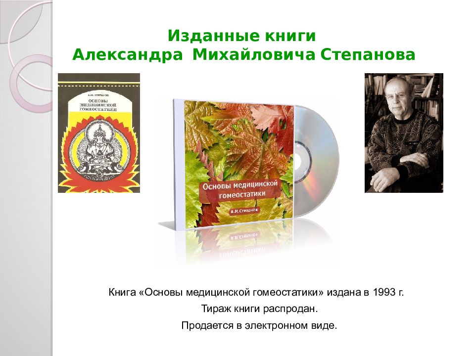 Книга «Основы медицинской гомеостатики » издана в 1993 г. Тираж книги распродан. Продается в электронном виде.