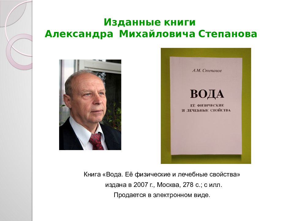 Книга «Вода. Её физические и лечебные свойства» издана в 2007 г., Москва, 278 с.; с илл. Продается в электронном виде.