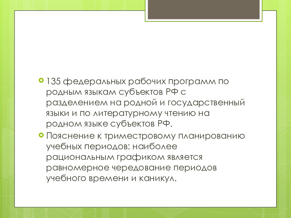135 федеральных рабочих программ по родным языкам субъектов РФ с разделением на родной и государственный языки и по литературному чтению на родном языке субъектов РФ. Пояснение к триместровому планированию учебных периодов: наиболее рациональным графиком является равномерное чередование периодов учебного времени и каникул.