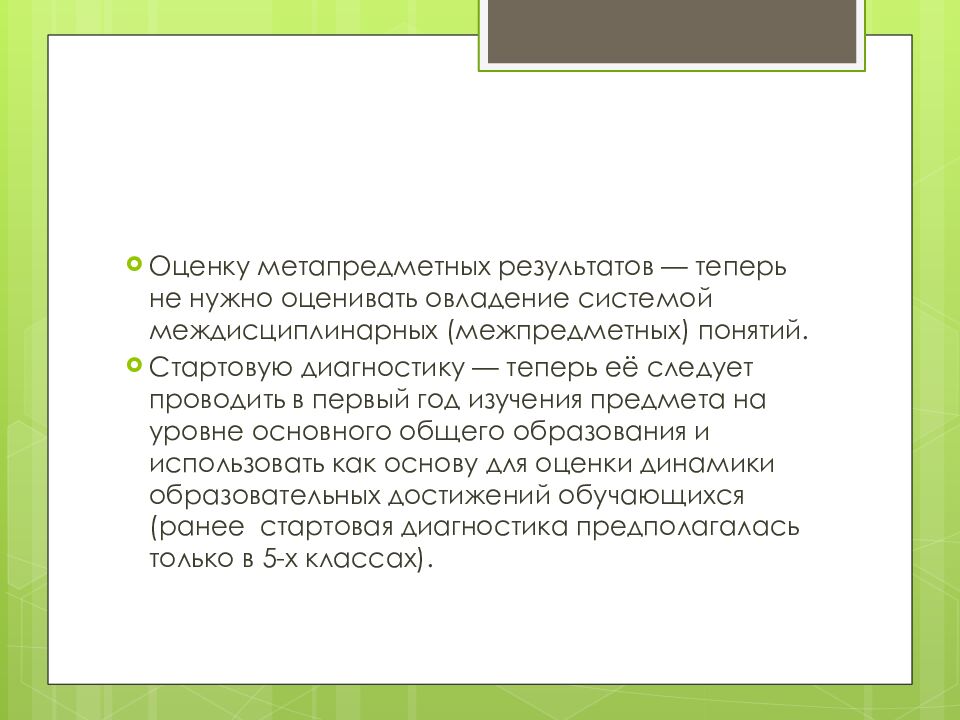 Оценку метапредметных результатов — теперь не нужно оценивать овладение системой междисциплинарных ( межпредметных ) понятий. Стартовую диагностику — теперь её следует проводить в первый год изучения предмета на уровне основного общего образования и использовать как основу для оценки динамики образовательных достижений обучающихся (ранее стартовая диагностика предполагалась только в 5-х классах).