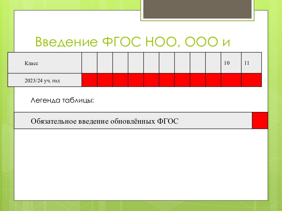 Класс 1 2 3 4 5 6 7 8 9 10 11 2023/24 уч. год Легенда таблицы: Обязательное введение обновлённых ФГОС