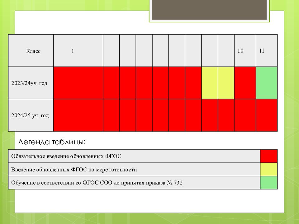 Класс 1 2 3 4 5 6 7 8 9 10 11 2023/24уч. год 2024/25 уч. год Легенда таблицы: Обязательное введение обновлённых ФГОС Введение обновлённых ФГОС по мере готовности Обучение в соответствии со ФГОС СОО до принятия приказа № 732