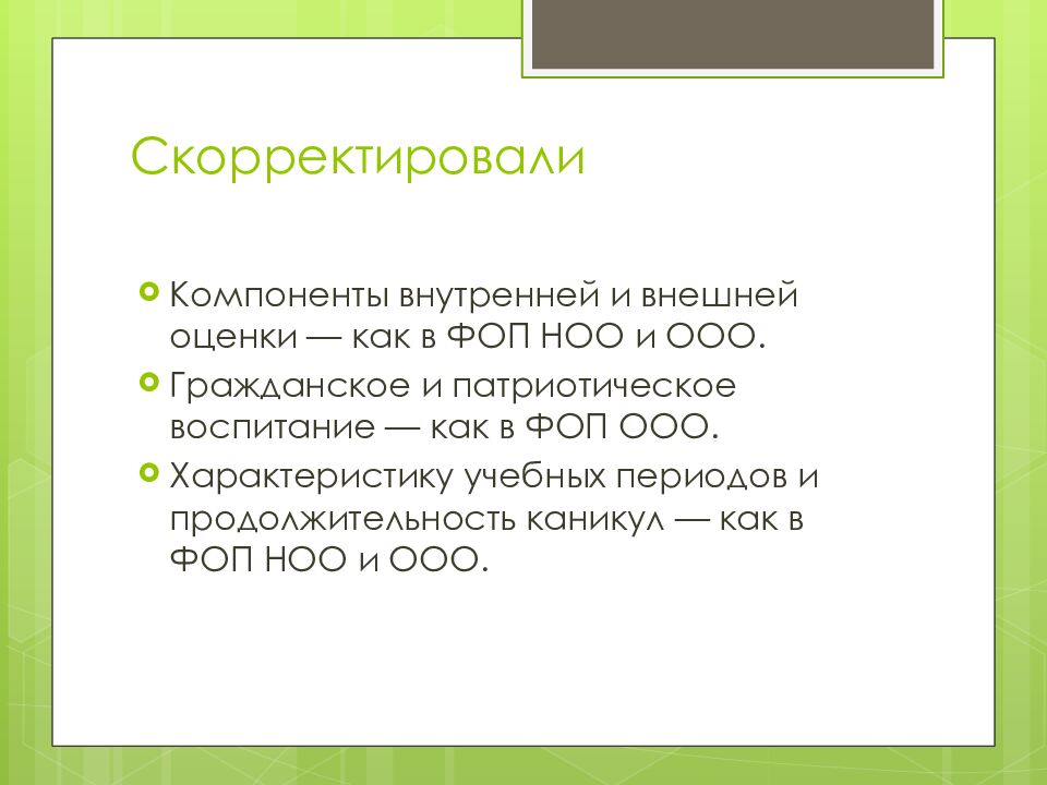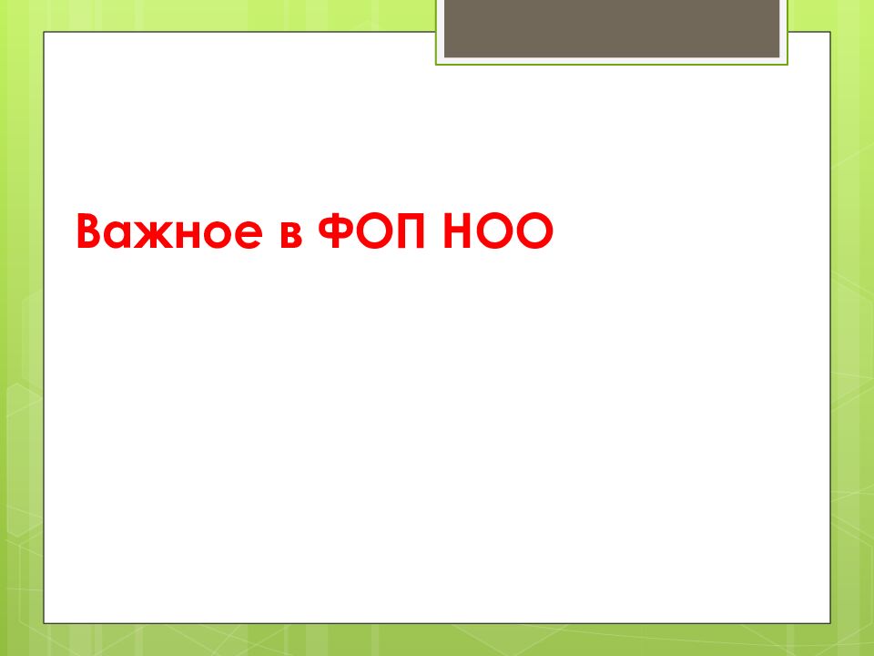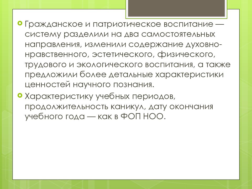 Гражданское и патриотическое воспитание — систему разделили на два самостоятельных направления, изменили содержание духовно-нравственного, эстетического, физического, трудового и экологического воспитания, а также предложили более детальные характеристики ценностей научного познания. Характеристику учебных периодов, продолжительность каникул, дату окончания учебного года — как в ФОП НОО.