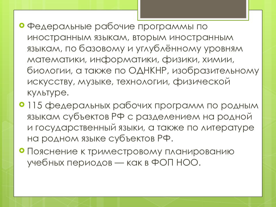 Федеральные рабочие программы по иностранным языкам, вторым иностранным языкам, по базовому и углублённому уровням математики, информатики, физики, химии, биологии, а также по ОДНКНР, изобразительному искусству, музыке, технологии, физической культуре. 115 федеральных рабочих программ по родным языкам субъектов РФ с разделением на родной и государственный языки, а также по литературе на родном языке субъектов РФ. Пояснение к триместровому планированию учебных периодов — как в ФОП НОО.