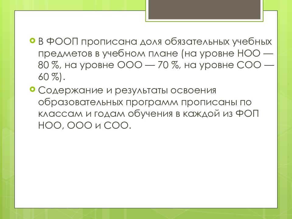 В ФООП прописана доля обязательных учебных предметов в учебном плане (на уровне НОО — 80 %, на уровне ООО — 70 %, на уровне СОО — 60 %). Содержание и результаты освоения образовательных программ прописаны по классам и годам обучения в каждой из ФОП НОО, ООО и СОО.