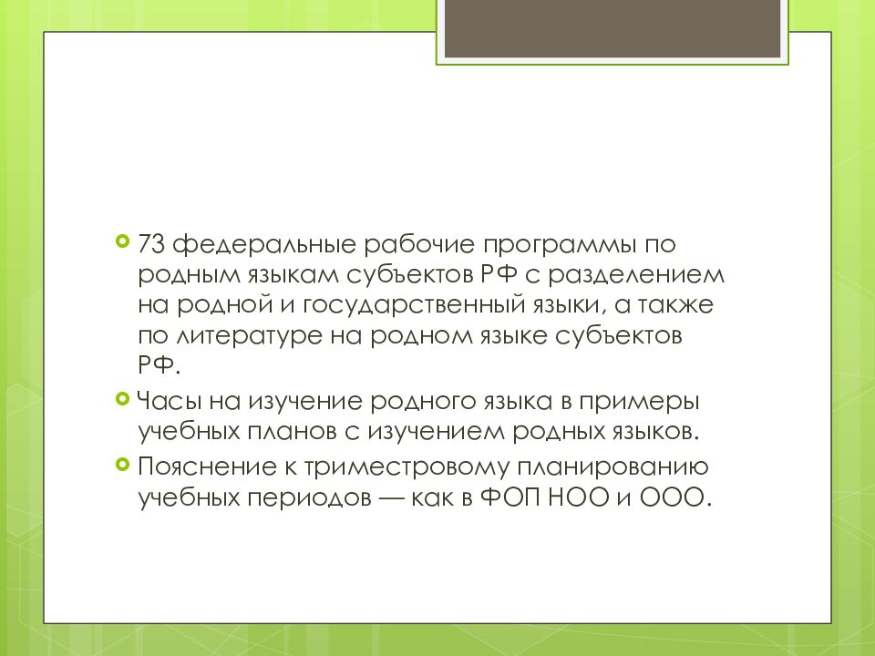 73 федеральные рабочие программы по родным языкам субъектов РФ с разделением на родной и государственный языки, а также по литературе на родном языке субъектов РФ. Часы на изучение родного языка в примеры учебных планов с изучением родных языков. Пояснение к триместровому планированию учебных периодов — как в ФОП НОО и ООО.