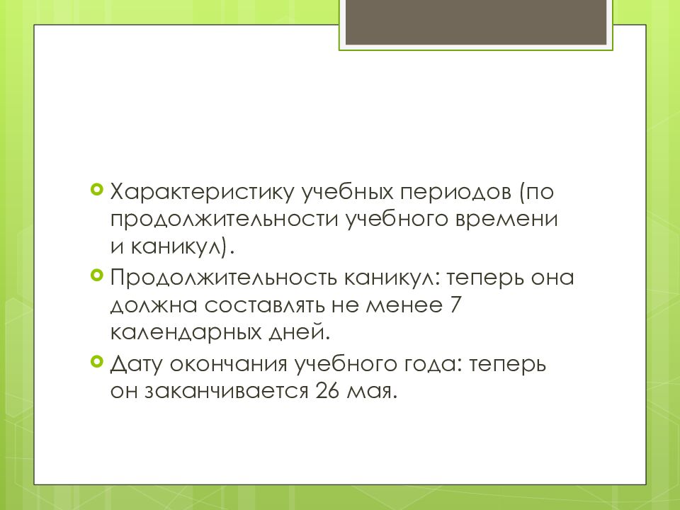 Характеристику учебных периодов (по продолжительности учебного времени и каникул). Продолжительность каникул: теперь она должна составлять не менее 7 календарных дней. Дату окончания учебного года: теперь он заканчивается 26 мая.
