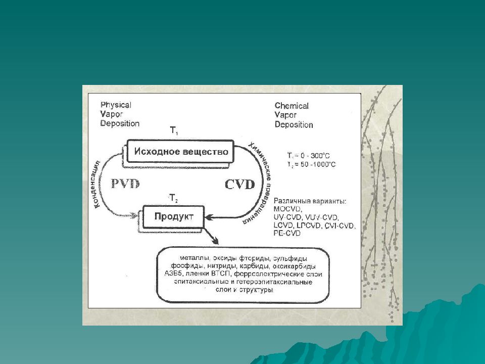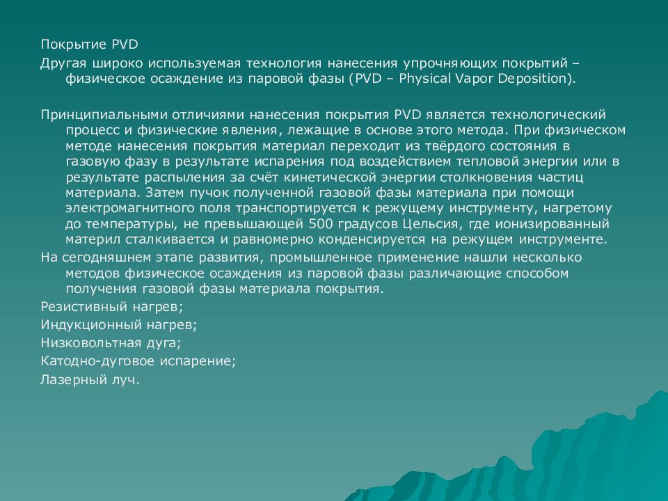 Покрытие PVD Другая широко используемая технология нанесения упрочняющих покрытий – физическое осаждение из паровой фазы (PVD – Physical Vapor Deposition). Принципиальными отличиями нанесения покрытия PVD является технологический процесс и физические явления, лежащие в основе этого метода. При физическом методе нанесения покрытия материал переходит из твёрдого состояния в газовую фазу в результате испарения под воздействием тепловой энергии или в результате распыления за счёт кинетической энергии столкновения частиц материала. Затем пучок полученной газовой фазы материала при помощи электромагнитного поля транспортируется к режущему инструменту, нагретому до температуры, не превышающей 500 градусов Цельсия, где ионизированный материл сталкивается и равномерно конденсируется на режущем инструменте. На сегодняшнем этапе развития, промышленное применение нашли несколько методов физическое осаждения из паровой фазы различающие способом получения газовой фазы материала покрытия. Резистивный нагрев; Индукционный нагрев; Низковольтная дуга; Катодно-дуговое испарение; Лазерный луч.