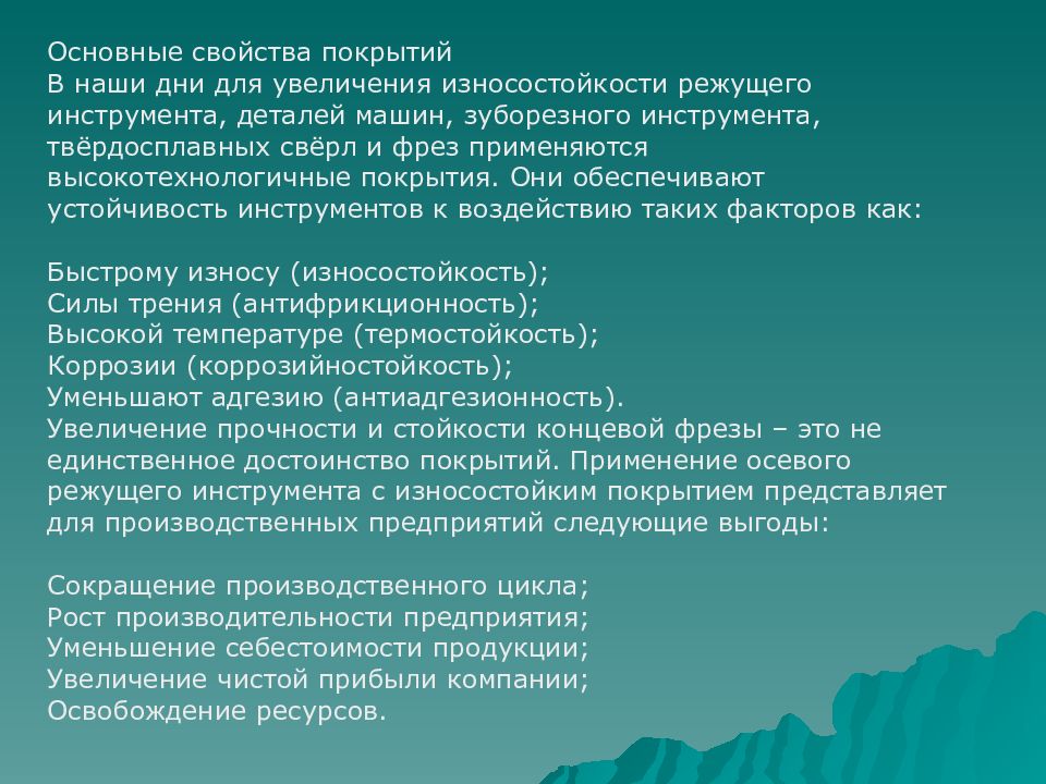 Основные свойства покрытий В наши дни для увеличения износостойкости режущего инструмента, деталей машин, зуборезного инструмента, твёрдосплавных свёрл и фрез применяются высокотехнологичные покрытия. Они обеспечивают устойчивость инструментов к воздействию таких факторов как: Быстрому износу (износостойкость); Силы трения (антифрикционность); Высокой температуре (термостойкость); Коррозии (коррозийностойкость); Уменьшают адгезию (антиадгезионность). Увеличение прочности и стойкости концевой фрезы – это не единственное достоинство покрытий. Применение осевого режущего инструмента с износостойким покрытием представляет для производственных предприятий следующие выгоды: Сокращение производственного цикла; Рост производительности предприятия; Уменьшение себестоимости продукции; Увеличение чистой прибыли компании; Освобождение ресурсов.