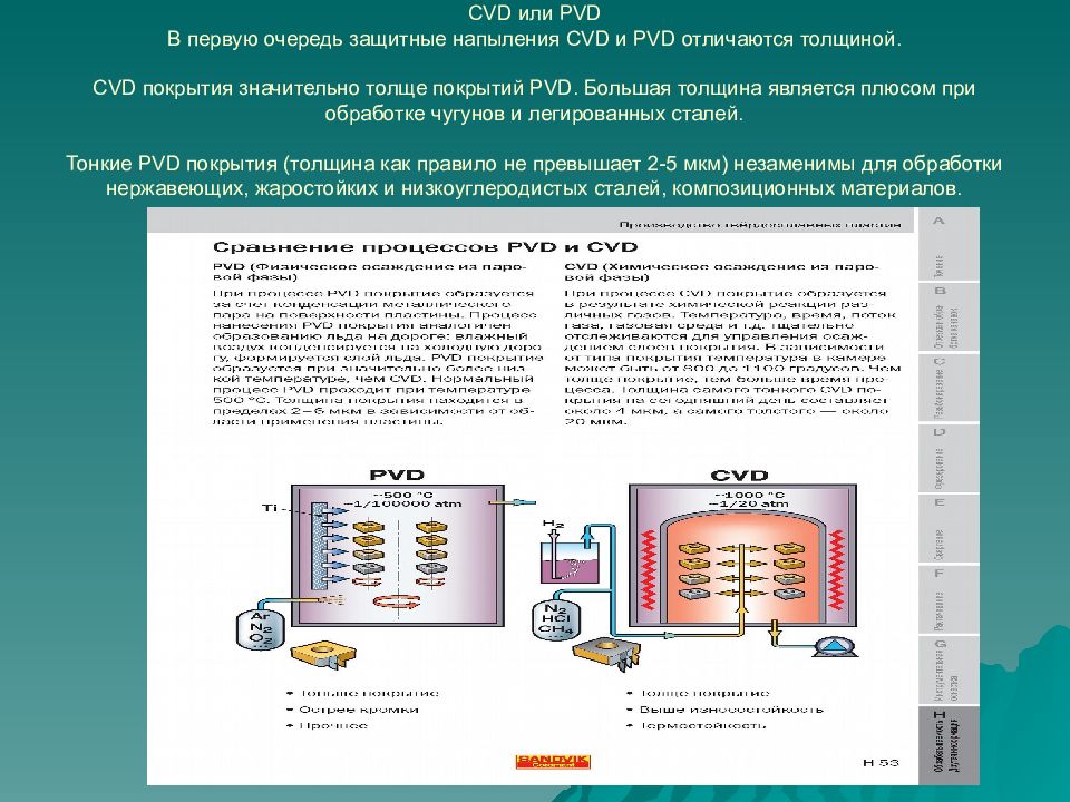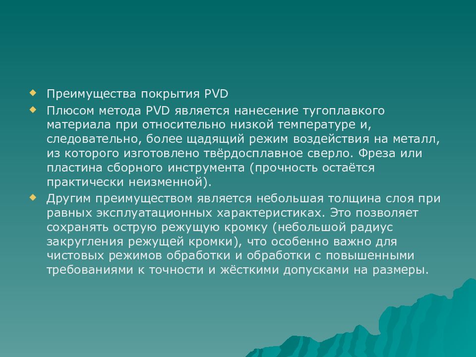 Преимущества покрытия PVD Плюсом метода PVD является нанесение тугоплавкого материала при относительно низкой температуре и, следовательно, более щадящий режим воздействия на металл, из которого изготовлено твёрдосплавное сверло. Фреза или пластина сборного инструмента (прочность остаётся практически неизменной). Другим преимуществом является небольшая толщина слоя при равных эксплуатационных характеристиках. Это позволяет сохранять острую режущую кромку (небольшой радиус закругления режущей кромки), что особенно важно для чистовых режимов обработки и обработки с повышенными требованиями к точности и жёсткими допусками на размеры.