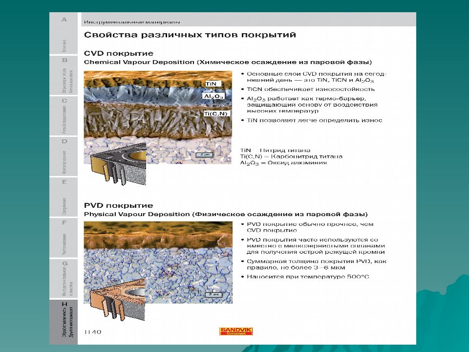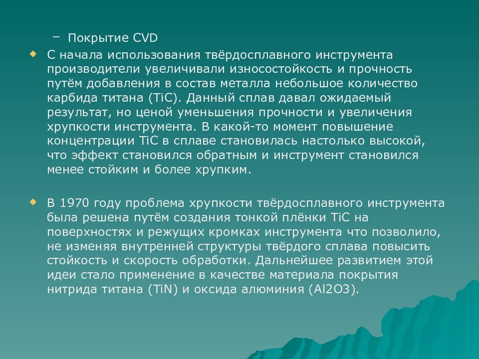 Покрытие CVD С начала использования твёрдосплавного инструмента производители увеличивали износостойкость и прочность путём добавления в состав металла небольшое количество карбида титана (TiC). Данный сплав давал ожидаемый результат, но ценой уменьшения прочности и увеличения хрупкости инструмента. В какой-то момент повышение концентрации TiC в сплаве становилась настолько высокой, что эффект становился обратным и инструмент становился менее стойким и более хрупким. В 1970 году проблема хрупкости твёрдосплавного инструмента была решена путём создания тонкой плёнки TiC на поверхностях и режущих кромках инструмента что позволило, не изменяя внутренней структуры твёрдого сплава повысить стойкость и скорость обработки. Дальнейшее развитием этой идеи стало применение в качестве материала покрытия нитрида титана (TiN) и оксида алюминия (Al2O3).
