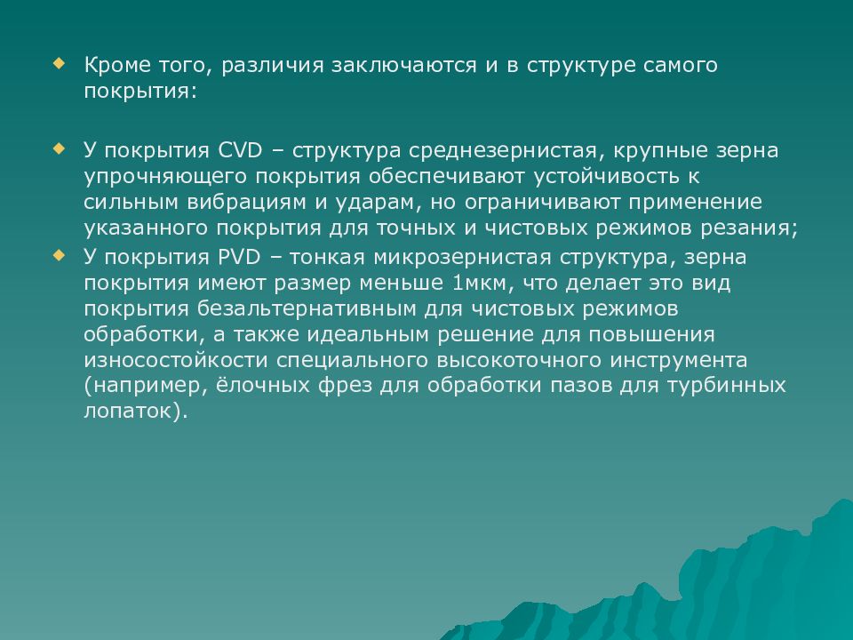 Кроме того, различия заключаются и в структуре самого покрытия: У покрытия CVD – структура среднезернистая, крупные зерна упрочняющего покрытия обеспечивают устойчивость к сильным вибрациям и ударам, но ограничивают применение указанного покрытия для точных и чистовых режимов резания; У покрытия PVD – тонкая микрозернистая структура, зерна покрытия имеют размер меньше 1мкм, что делает это вид покрытия безальтернативным для чистовых режимов обработки, а также идеальным решение для повышения износостойкости специального высокоточного инструмента (например, ёлочных фрез для обработки пазов для турбинных лопаток).