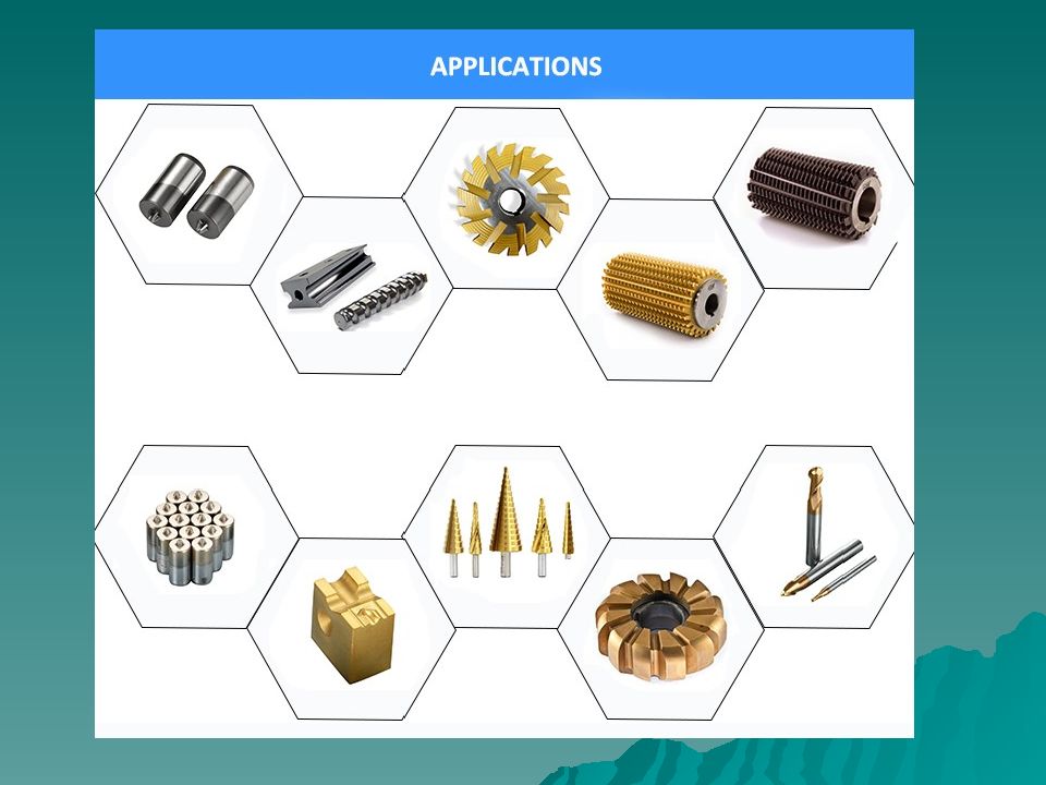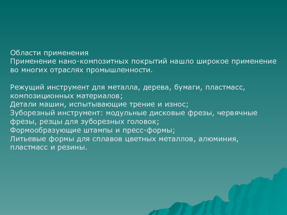 Области применения Применение нано-композитных покрытий нашло широкое применение во многих отраслях промышленности. Режущий инструмент для металла, дерева, бумаги, пластмасс, композиционных материалов; Детали машин, испытывающие трение и износ; Зуборезный инструмент: модульные дисковые фрезы, червячные фрезы, резцы для зуборезных головок; Формообразующие штампы и пресс-формы; Литьевые формы для сплавов цветных металлов, алюминия, пластмасс и резины.