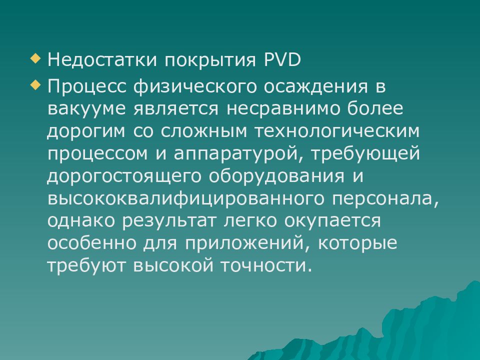 Недостатки покрытия PVD Процесс физического осаждения в вакууме является несравнимо более дорогим со сложным технологическим процессом и аппаратурой, требующей дорогостоящего оборудования и высококвалифицированного персонала, однако результат легко окупается особенно для приложений, которые требуют высокой точности.