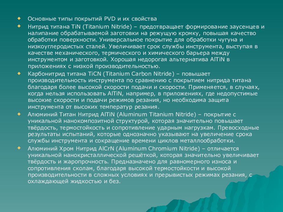 Основные типы покрытий PVD и их свойства Нитрид титана TiN (Titanium Nitride) – предотвращает формирование заусенцев и налипание обрабатываемой заготовки на режущую кромку, повышая качество обработки поверхности. Универсальное покрытие для обработки чугуна и низкоуглеродистых сталей. Увеличивает срок службы инструмента, выступая в качестве механического, термического и химического барьера между инструментом и заготовкой. Хорошая недорогая альтернатива AlTiN в приложениях с низкой производительностью. Карбонитрид титана TiCN (Titanium Carbon Nitride) – повышает производительность инструмента по сравнению с покрытием нитрида титана благодаря более высокой скорости подачи и скорости. Применяется, в случаях, когда нельзя использовать AlTiN, например, в приложениях, где недопустимые высокие скорости и подачи режимов резания, но необходима защита инструмента от высоких температур резания. Алюминий Титан Нитрид AlTiN (Aluminum Titanium Nitride) – покрытие с уникальной нанокомпозитной структурой, которая значительно повышает твёрдость, термостойкость и сопротивление ударным нагрузкам. Превосходные результаты испытаний, которые однозначно указывают на увеличение срока службы инструмента и сокращение времени циклов металлообработки. Алюминий Хром Нитрид AlCrN (Aluminum Chromium Nitride) – отличается уникальной нанокристаллической решёткой, которая значительно увеличивает твёрдость и жаропрочность. Предназначено для равномерного износа и сопротивления сколам, благодаря высокой термостойкости и высокой производительности в сложных условиях и прерывистых режимах резания, с охлаждающей жидкостью и без.