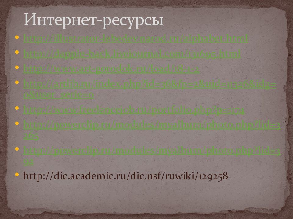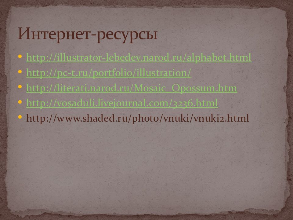 http://illustrator-lebedev.narod.ru/alphabet.html http://pc-t.ru/portfolio/illustration/ http://literati.narod.ru/Mosaic_Opossum.htm http://vosaduli.livejournal.com/3236.html http://www.shaded.ru/photo/vnuki/vnuki2.html Интернет-ресурсы