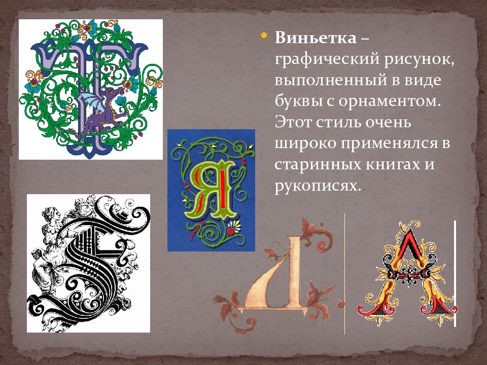 Виньетка – графический рисунок, выполненный в виде буквы с орнаментом. Этот стиль очень широко применялся в старинных книгах и рукописях.