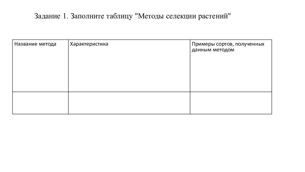 Слайд 7: Задание 1. Заполните таблицу "Методы селекции растений"