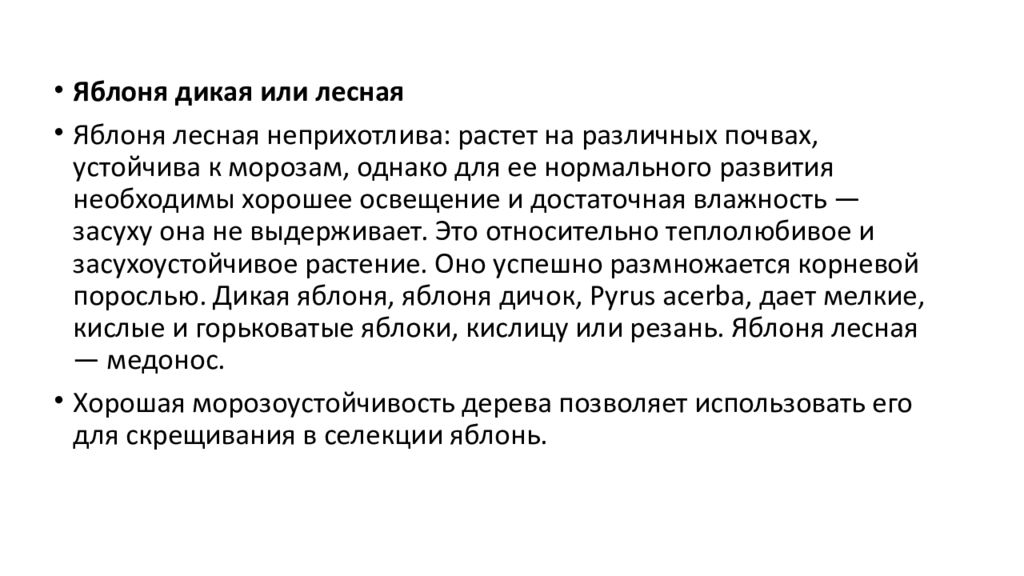 Яблоня дикая или лесная Яблоня лесная неприхотлива: растет на различных почвах, устойчива к морозам, однако для ее нормального развития необходимы хорошее освещение и достаточная влажность — засуху она не выдерживает. Это относительно теплолюбивое и засухоустойчивое растение. Оно успешно размножается корневой порослью. Дикая яблоня, яблоня дичок, Pyrus acerba, дает мелкие, кислые и горьковатые яблоки, кислицу или резань. Яблоня лесная — медонос. Хорошая морозоустойчивость дерева позволяет использовать его для скрещивания в селекции яблонь.