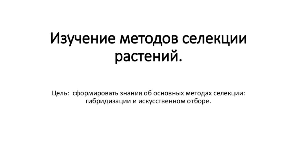 Цель : сформировать знания об основных методах селекции: гибридизации и искусственном отборе.