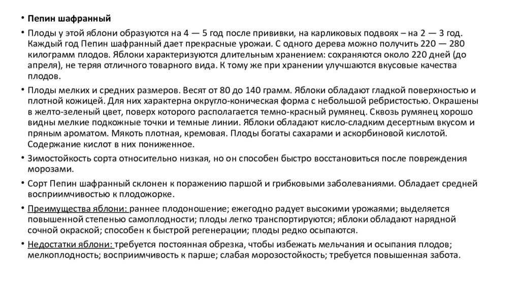 Пепин шафранный Плоды у этой яблони образуются на 4 — 5 год после прививки, на карликовых подвоях – на 2 — 3 год. Каждый год Пепин шафранный дает прекрасные урожаи. С одного дерева можно получить 220 — 280 килограмм плодов. Яблоки характеризуются длительным хранением: сохраняются около 220 дней (до апреля), не теряя отличного товарного вида. К тому же при хранении улучшаются вкусовые качества плодов. Плоды мелких и средних размеров. Весят от 80 до 140 грамм. Яблоки обладают гладкой поверхностью и плотной кожицей. Для них характерна округло-коническая форма с небольшой ребристостью. Окрашены в желто-зеленый цвет, поверх которого располагается темно-красный румянец. Сквозь румянец хорошо видны мелкие подкожные точки и темные линии. Яблоки обладают кисло-сладким десертным вкусом и пряным ароматом. Мякоть плотная, кремовая. Плоды богаты сахарами и аскорбиновой кислотой. Содержание кислот в них пониженное. Зимостойкость сорта относительно низкая, но он способен быстро восстановиться после повреждения морозами. Сорт Пепин шафранный склонен к поражению паршой и грибковыми заболеваниями. Обладает средней восприимчивостью к плодожорке. Преимущества яблони: раннее плодоношение; ежегодно радует высокими урожаями; выделяется повышенной степенью самоплодности ; плоды легко транспортируются; яблоки обладают нарядной сочной окраской; способен к быстрой регенерации; плоды редко осыпаются. Недостатки яблони: требуется постоянная обрезка, чтобы избежать мельчания и осыпания плодов; мелкоплодность; восприимчивость к парше; слабая морозостойкость; требуется повышенная забота.