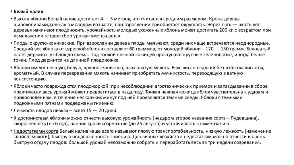 Белый налив Высота яблони Белый налив достигает 4 — 5 метров, что считается средним размером. Крона дерева широкопирамидальная в молодом возрасте, при взрослении приобретает округлость. Через пять — шесть лет деревья начинают плодоносить, урожайность молодых ухоженных яблонь может достигать 200 кг, с возрастом при измельчении плодов сбор урожая уменьшается. Плоды округло-конические. При взрослении дерева плоды мельчают, среди них чаще встречаются неоднородные. Средний вес яблока от взрослой яблони составляет 60 граммов, от молодой яблони – 120 — 150 грамм. Беловатый налет держится у яблок до съема. Под тонкой нежной кожицей проступают крупные зеленоватые, иногда белые точки. Плод держится на длинной плодоножке. Яблоки имеют нежную, белую, крупнозернистую, рыхловатую мякоть. Вкус кисло-сладкий без избытка кислоты, ароматный. В случае перезревания мякоть начинает приобретать мучнистость, переходящую в ватную консистенцию. Яблоки часто повреждаются плодожоркой: при несоблюдении агротехнических приемов и запаздывании в сборе практически весь урожай может превратиться в падалицу. Тонкая нежная кожица яблок чувствительна к ударам и прикосновениям: в течение нескольких минут под ней проявляются темные следы. Яблоки с темными подкожными пятнами подвержены гниению. Лежкость плодов низкая – всего 15 — 20 дней. К достоинствам яблони можно отнести высокую урожайность (недаром второе название сорта – Пудовщина ), скороспелость (на 6 год), ранние сроки созревания (до 25 августа) и устойчивость к вымерзанию. Недостатками сорта Белый налив чаще всего называют плохую транспортабельность, низкую лежкость (изменение свойств мякоти), быструю подверженность гниению. Для личных хозяйств к недостаткам можно отнести и очень быструю отдачу плодов: большой урожай невозможно собрать и переработать весь за три недели созревания.