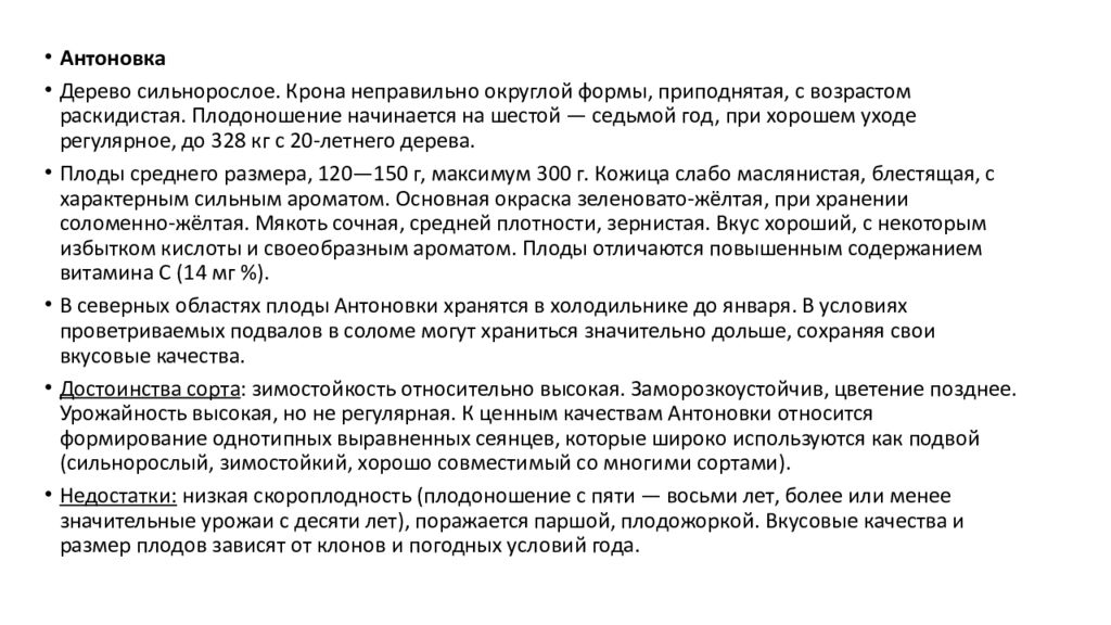 Антоновка Дерево сильнорослое. Крона неправильно округлой формы, приподнятая, с возрастом раскидистая. Плодоношение начинается на шестой — седьмой год, при хорошем уходе регулярное, до 328 кг с 20-летнего дерева. Плоды среднего размера, 120—150 г, максимум 300 г. Кожица слабо маслянистая, блестящая, с характерным сильным ароматом. Основная окраска зеленовато-жёлтая, при хранении соломенно-жёлтая. Мякоть сочная, средней плотности, зернистая. Вкус хороший, с некоторым избытком кислоты и своеобразным ароматом. Плоды отличаются повышенным содержанием витамина С (14 мг %). В северных областях плоды Антоновки хранятся в холодильнике до января. В условиях проветриваемых подвалов в соломе могут храниться значительно дольше, сохраняя свои вкусовые качества. Достоинства сорта : зимостойкость относительно высокая. Заморозкоустойчив, цветение позднее. Урожайность высокая, но не регулярная. К ценным качествам Антоновки относится формирование однотипных выравненных сеянцев, которые широко используются как подвой (сильнорослый, зимостойкий, хорошо совместимый со многими сортами). Недостатки: низкая скороплодность (плодоношение с пяти — восьми лет, более или менее значительные урожаи с десяти лет), поражается паршой, плодожоркой. Вкусовые качества и размер плодов зависят от клонов и погодных условий года.