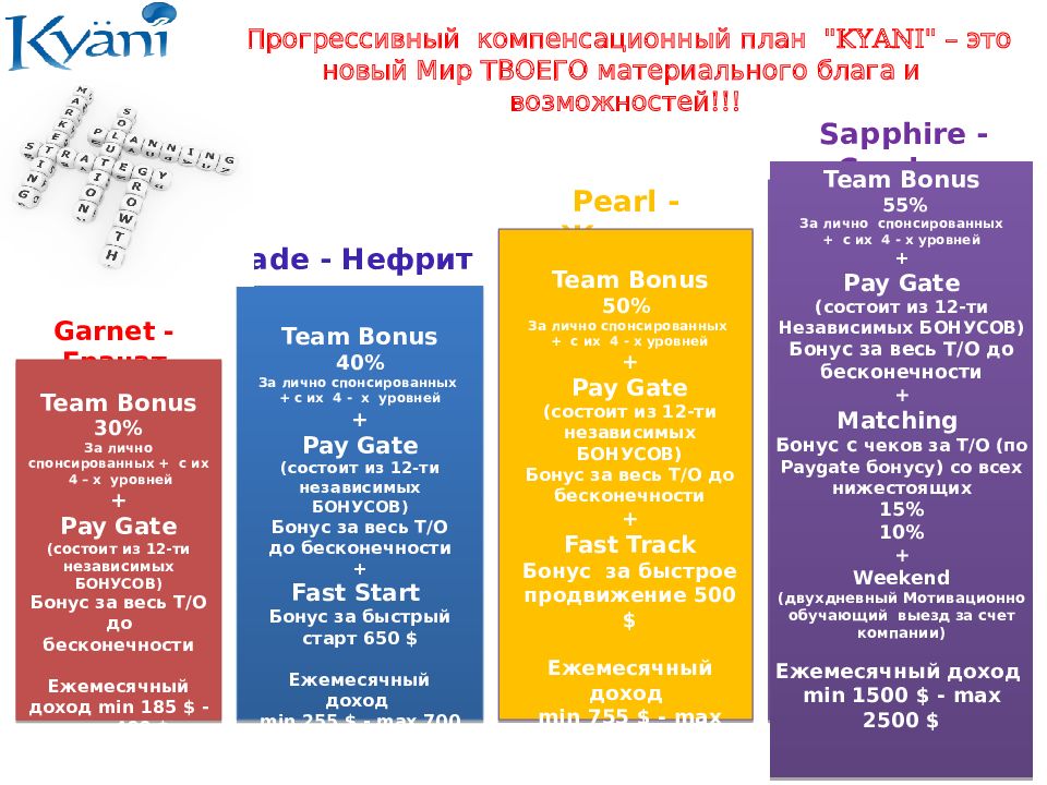 Jade - Нефрит Pearl - Жемчуг Sapphire - Сапфир Team Bonus 40 % За лично спонсированных + с их 4 - х уровней + Pay Gate (состоит из 12-ти независимых БОНУСОВ) Бонус за весь Т/О до бесконечности + Fast Start Бонус за быстрый старт 650 $ Ежемесячный доход min 255 $ - max 700 $ Team Bonus 50 % За лично спонсированных + с их 4 - х уровней + Pay G ate (состоит из 12-ти независимых БОНУСОВ) Бонус за весь Т/О до бесконечности + Fast Track Бонус за быстр ое продвижение 500 $ Ежемесячный доход min 755 $ - max 1300 $ Garnet - Гранат Team Bonus 30 % За лично спонсированных + с их 4 – х уровней + Pay Gate (состоит из 12-ти независимых БОНУСОВ) Бонус за весь Т/О до бесконечности Ежемесячный доход min 185 $ - max 400 $ Team Bonus 5 5% За лично спонсированных + с их 4 - х уровней + Pay Gate (состоит из 12-ти Независимых БОНУСОВ) Бонус за весь Т/О до бесконечности + Matching Бонус с чеков за Т/О (по Paygate бонусу) со всех нижестоящих 15 % 10 % + Weekend (двухдневный Мотивационно обучающий выезд за счет компании) Ежемесячный доход min 1500 $ - max 2500 $ Прогрессивный к омпенсационный п лан "KYANI" – это новый Мир ТВОЕГО материального блага и возможностей!!!